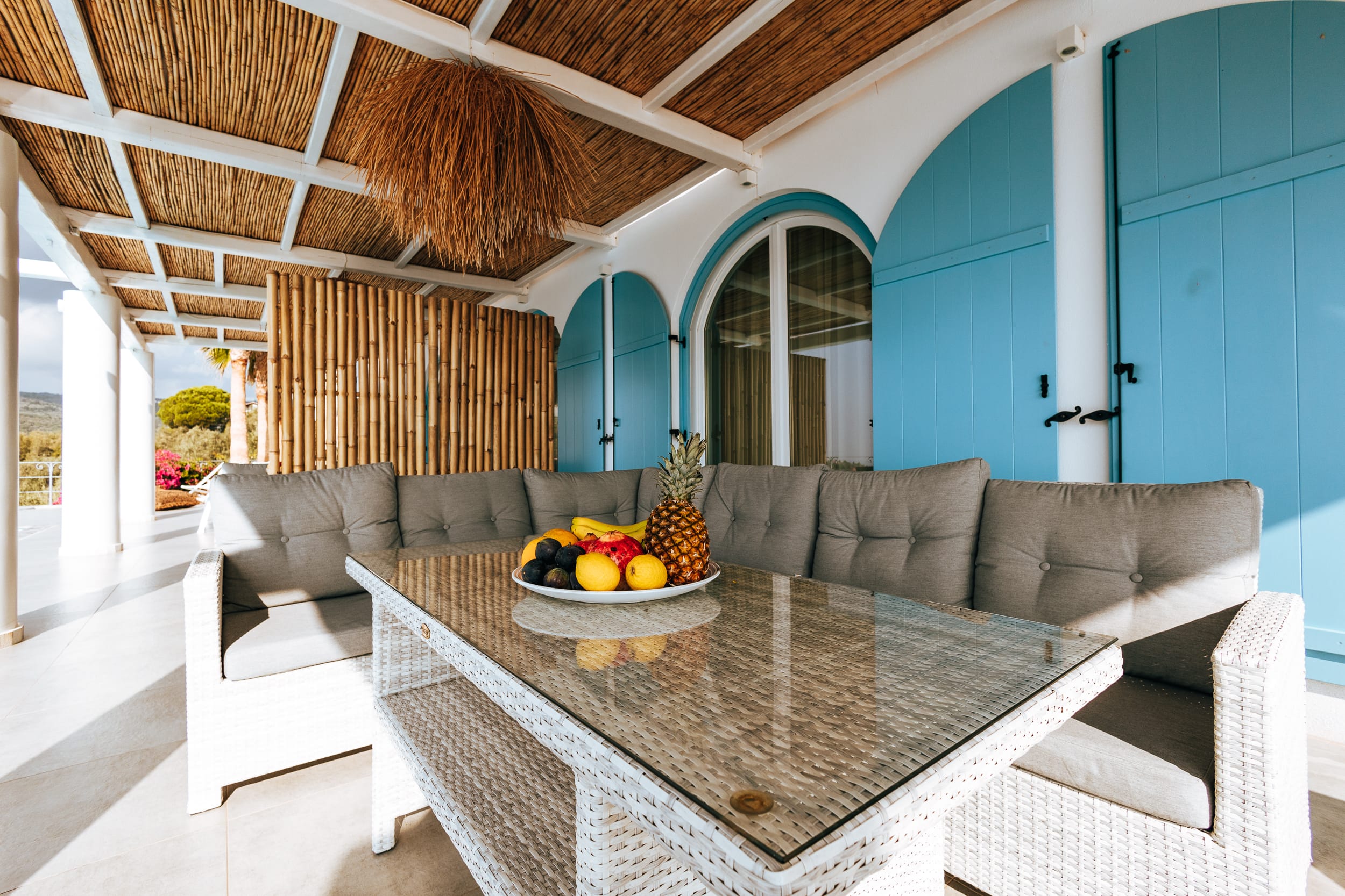 Zwei der Apartments befinden sich im Erdgeschoss und die anderen beiden im 1. Stock. Jedes verfügt über ein geräumiges, einladendes Wohnzimmer, das stilvoll eingerichtet ist, eine voll ausgestattete Küche, 2 komfortable Schlafzimmer (1 mit Doppelbett, 1 mit zwei Einzelbetten), ein luxuriöses großes Badezimmer mit Marmorspüle und Doppel-Dusche. Auf der Hauptveranda rund um den Pool gibt es Ess- und Sitzgelegenheiten sowie Liegestühle für alle Gäste. Das blaue Wasser des großen Schwimmbeckens geht nahtlos in den Horizont und das endlose Blau des Meeres über. Genießen Sie den Ausblick und einen einzigartigen Sonnenuntergang, entspannen Sie sich am Pool oder genießen Sie den Jacuzzi - ganz für sich, Ihre Familie oder Freunde. Die Villa bietet bis zu 8 gesicherte Parkplätze vor Ort. Das gesamte 7.000 qm große Grundstück rund um die Villa ist für zusätzliche Sicherheit und Privatsphäre eingezäunt.
